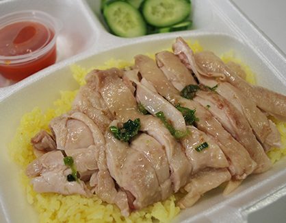 Hainanese Chicken is definitely a fan-favourite comfort food! Our chicken is poached expertly until the meat is tender and juicy. Comes with condiments: ginger spring onion sauce, sweet soy, chilli sauce, cucumber & hainanese rice.