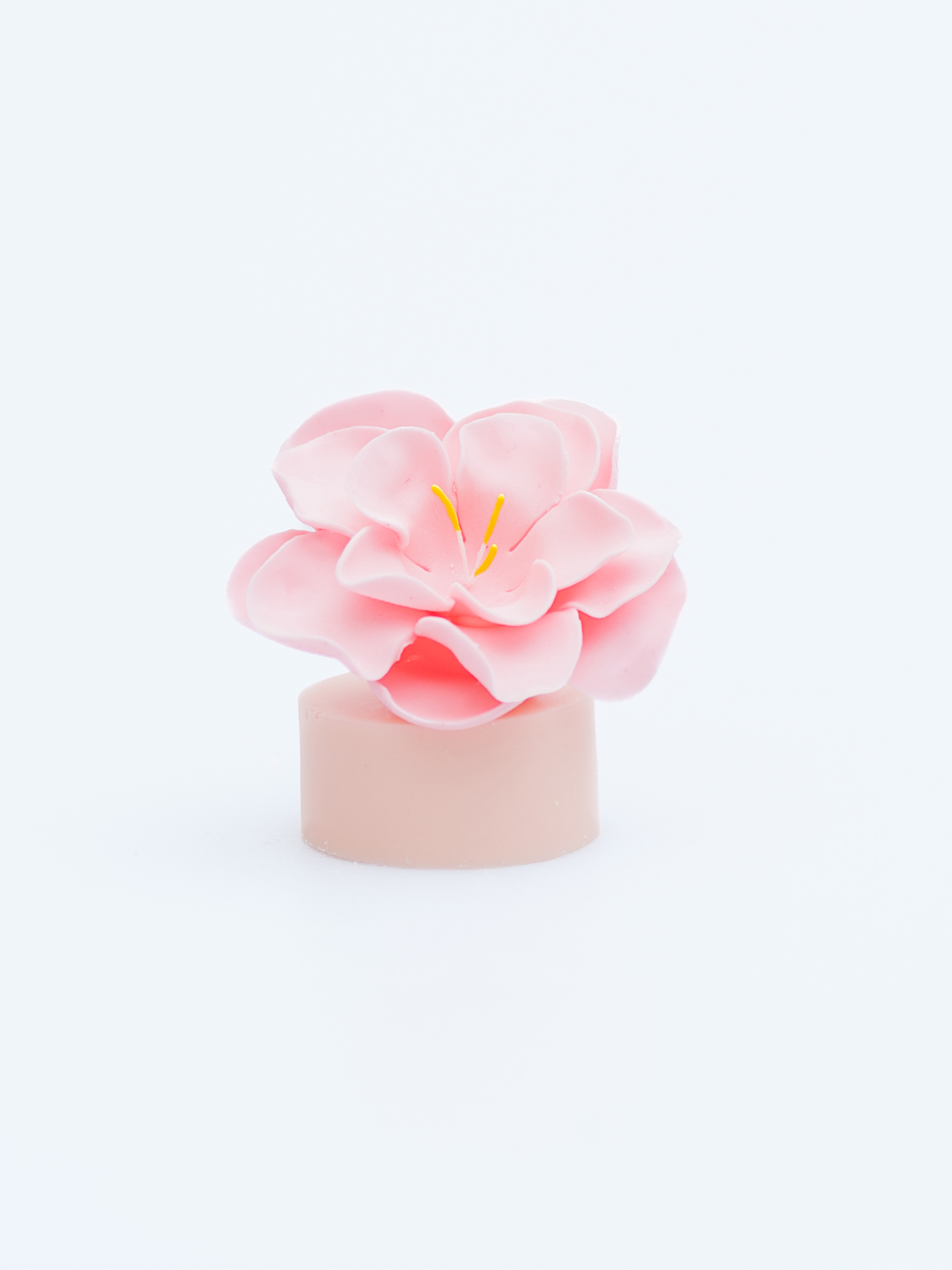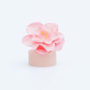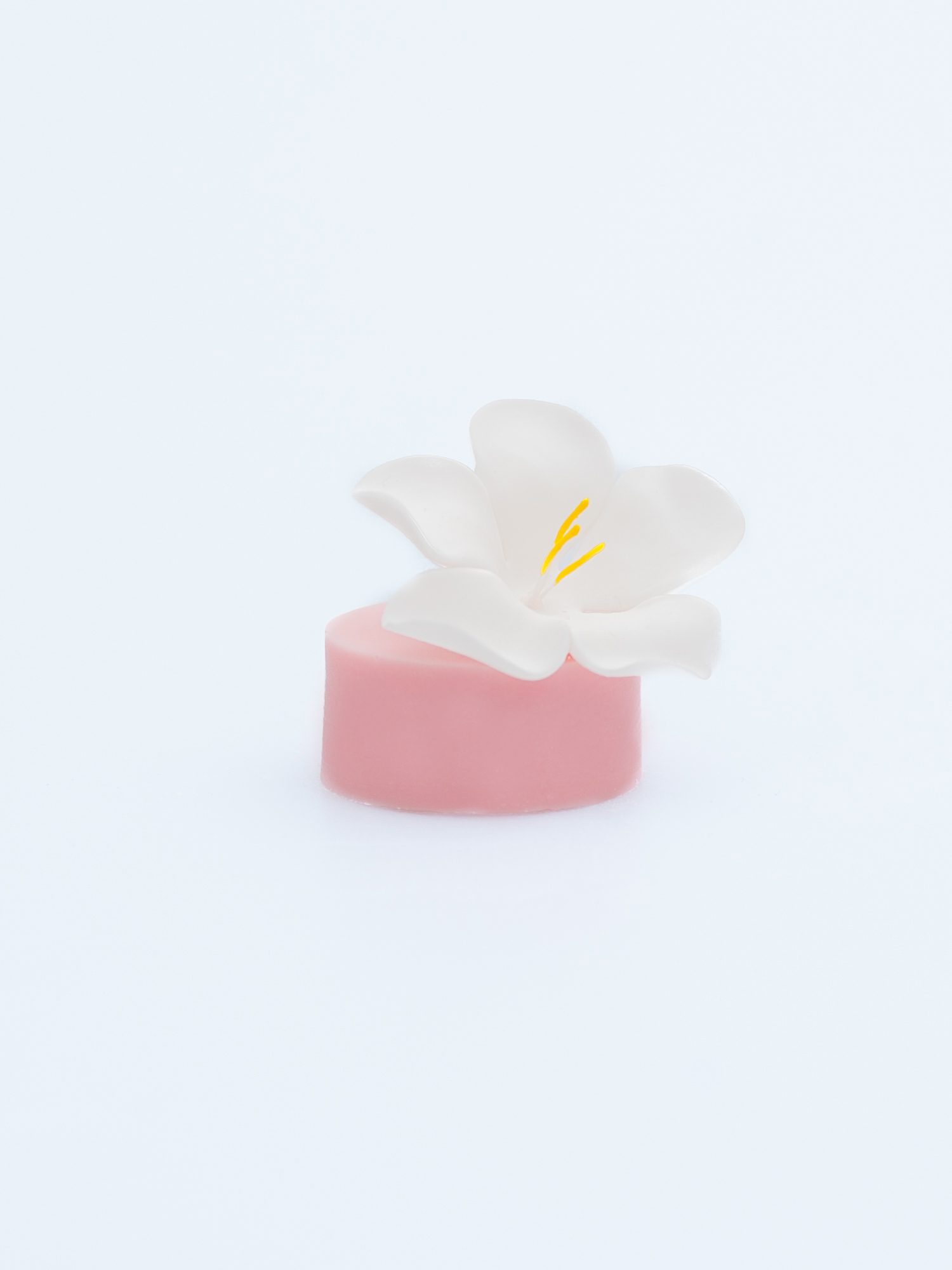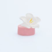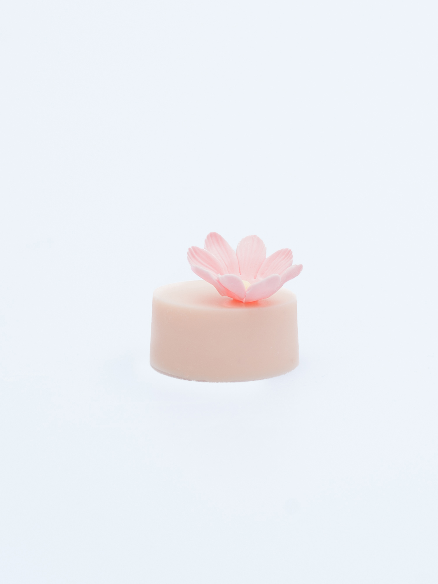 Hand piped raspberry gelatine flowers inside jelly. Served with lychee compote.